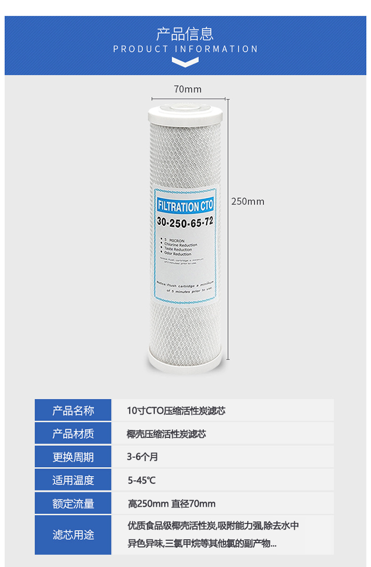 简要描述:CTO压缩活性炭滤芯:以好的果壳炭及煤质活性炭为原料,采用高科技技术,经特殊工艺加工而成,活性炭滤芯内外均分别包裹