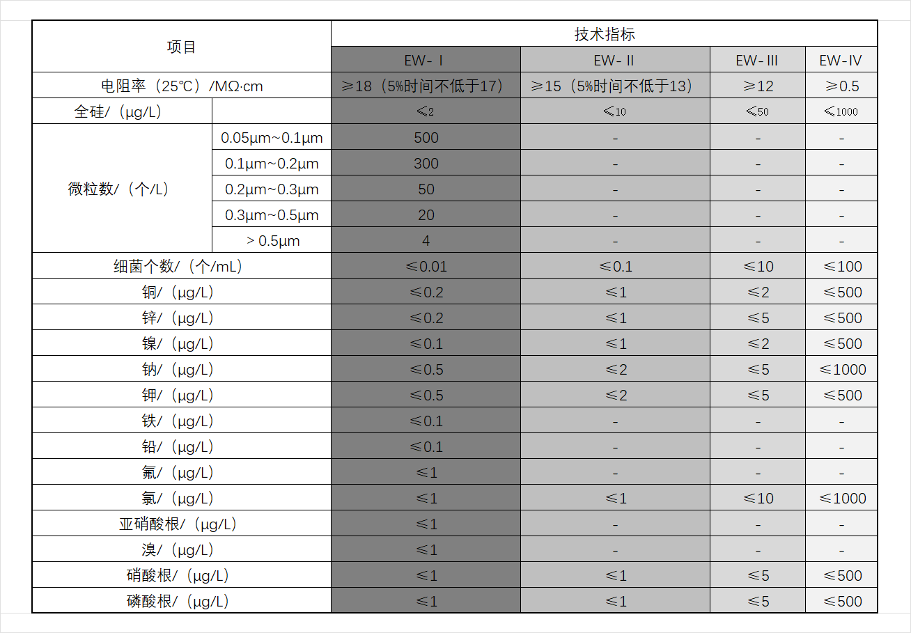 电子级水指的是电子和半导体工艺过程中所用的高纯水,我国的国家标准《GB/T 11446.1-2013电子级水》把电子级水分为4个类别,分别为Ⅰ级、Ⅱ级、Ⅲ级和Ⅳ级。